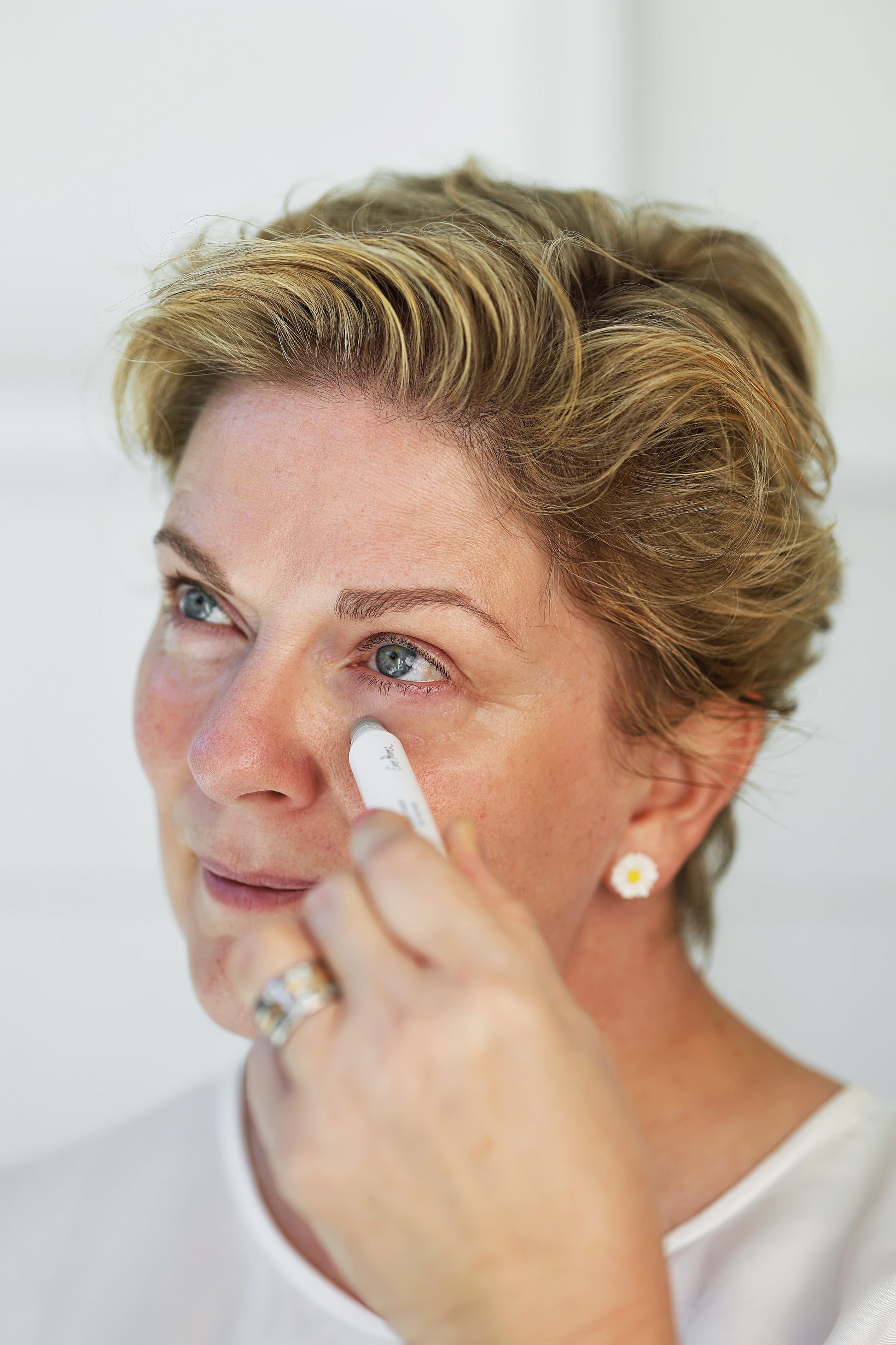 Using the roller, gently sweep across clean, dry skin from the outer corner of the eye, moving inwards. Repeat back and forth, 3-4 times.
