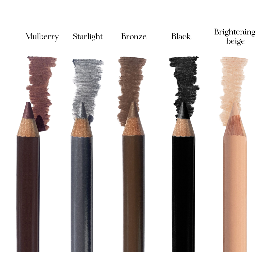 Line your eyes with this long wearing, natural vegan eye pencil. Take your look from simple line to a soft smokey eyeshadow by blending with the buffing brush.