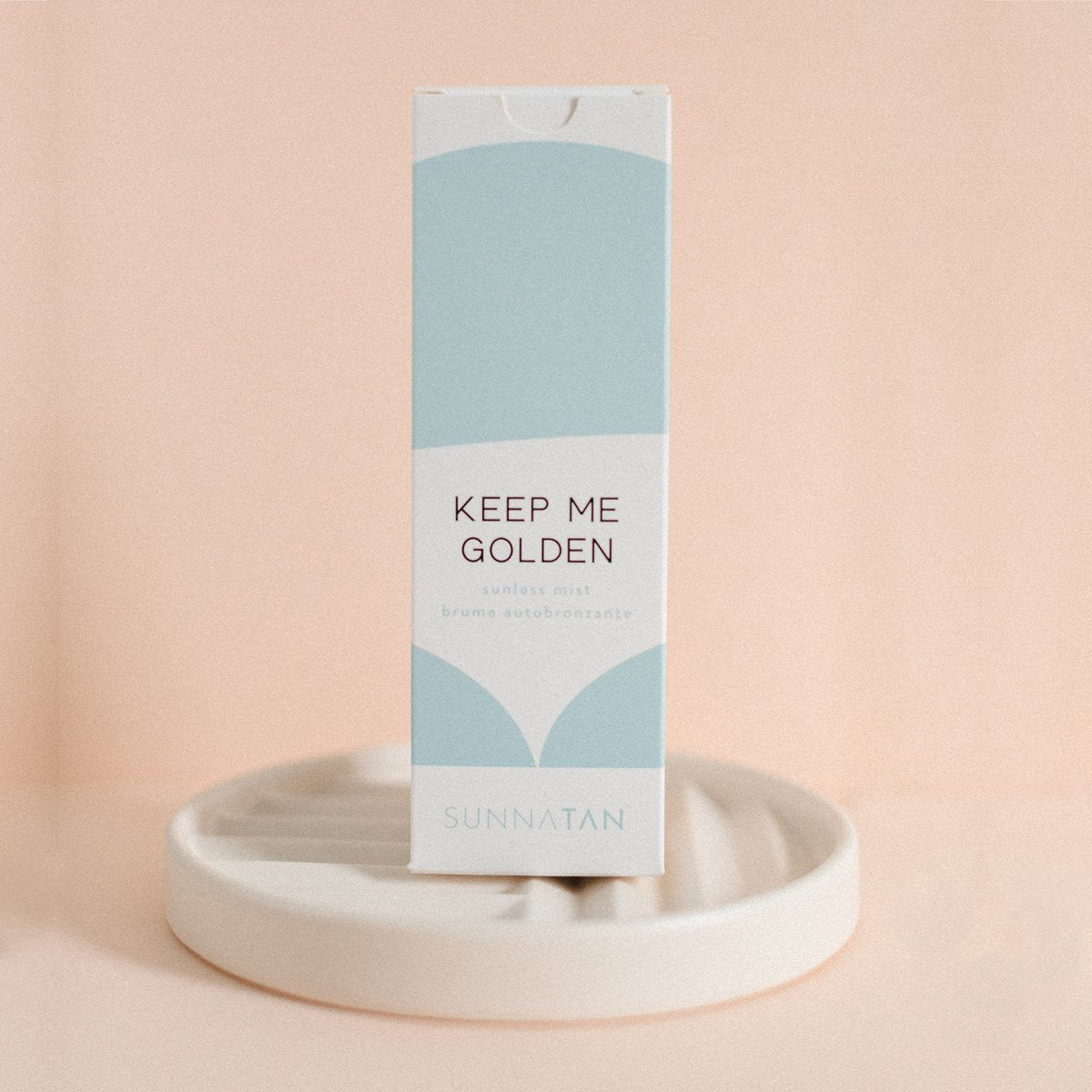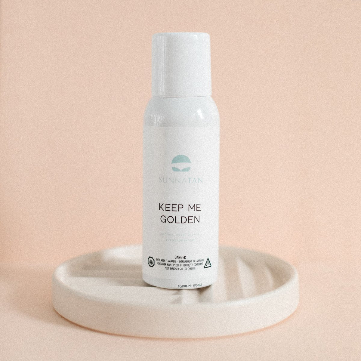 Keep Me Golden is a signature blend of SunnaTan ingredients now in a convenient spray can you can take on the go! Keep Me Golden is perfect for extending the life of your existing airbrush tan, or alone as a do-it yourself gradual glow. The self-tanning mist aerosol spray delivers an ultra fine mist for an easy to use application. Formulated with natural ingredients, the delicate hint of shimmer gives an immediate glow and allows for perfectly even application.